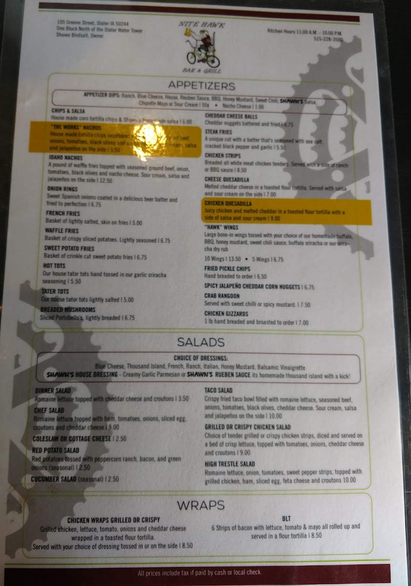 Welcome to Nite Hawk Bar & Grill, a delightful culinary haven nestled at 105 Greene St, Slater, IA. This vibrant spot is perfect for food lovers, offering an extensive menu that caters to all tastes. Start your meal with enticing appetizers like Cheddar Cheese Balls and Crab Rangoon, or indulge in delicious Idaho Nachos and crispy Chicken Strips.